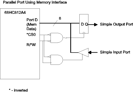External devices can also be interfaced to the 68HC12 memory bus. The 68HC812A4 microcontroller is designed for use with external memory and has four "chip select" signals which are for use in address decoding for peripheral devices rather than memory devices. Potentially hundreds of additional data registers can be accommodated. See External Memory/Peripheral Interfacing for details. The circuit below shows adding a simple parallel input port and separate parallel output port as chip select 0. For parts running in single chip mode, the external memory bus is not available.